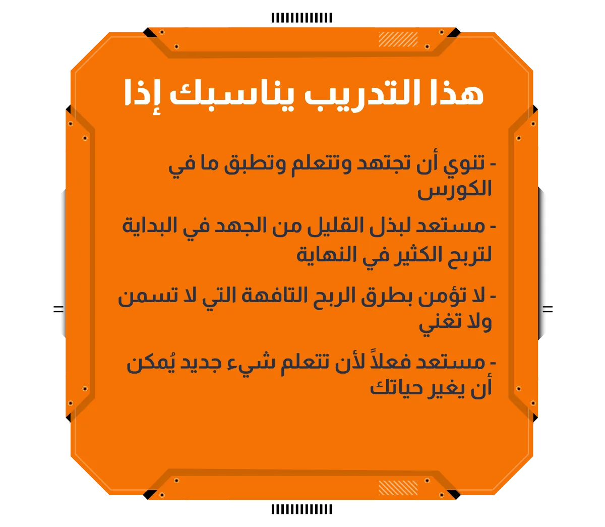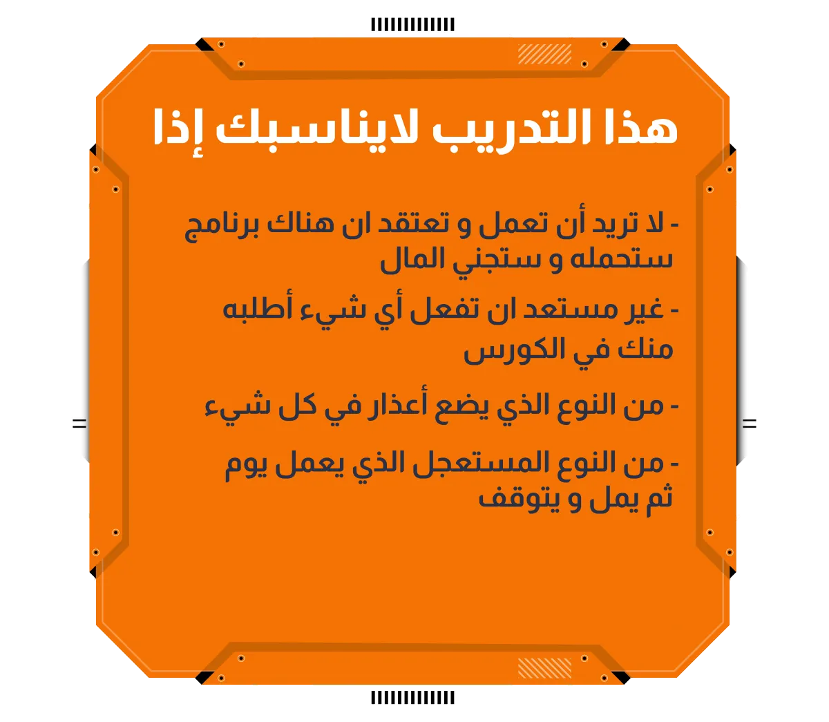 هذا البرنامج لن يتطلب منك اي شيء انت فقط تحتاج لابتوب و انترنت فقط نحن نوفر لك كل المتطلبات بحيث نضمن نجاحك ونضعك على الطريق الصحيح .